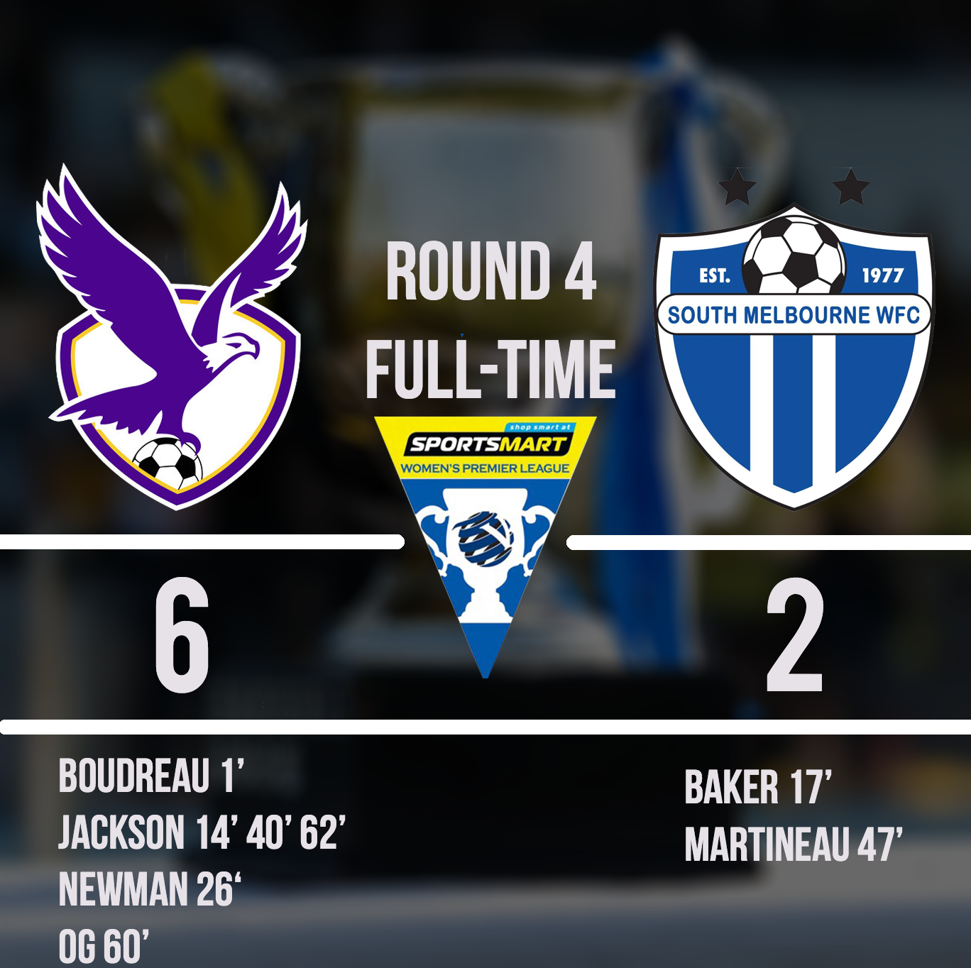Boroondara Eagles 6 (Boudreau 1′, Jackson 14′ 40′ 62′, Newman 26′, O.G 60′) defeated South Melbourne Women’s 2 (Baker 17′, Martineau 47′)