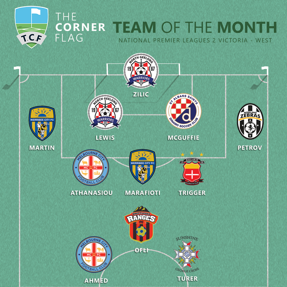 In one of the most topsy turvy months of football in recent memory, six teams recorded two wins, two teams one win, one team no wins, and one team all five in the NPL2 West. This leaves Melbourne City as the main beneficiaries with four players in the side, and a plethora of players from most of the other teams as well.