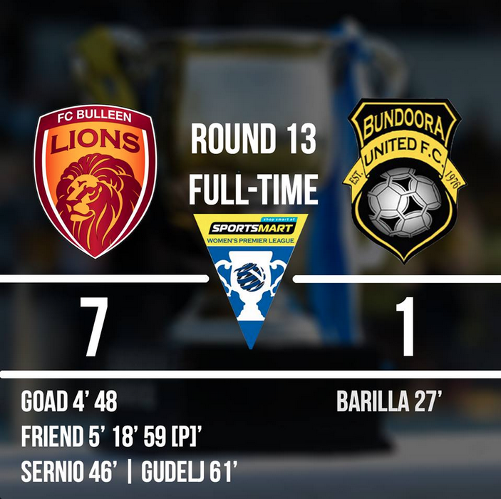 FC Bulleen Lions 7 (Goad 4’ 48’, Friend 5’ 18’ 59 [p]’, Sernio 46’, Gudelj 71’) defeated Bundoora United 1 (Barilla 27’) at David Barro Stadium [HT 3-1]