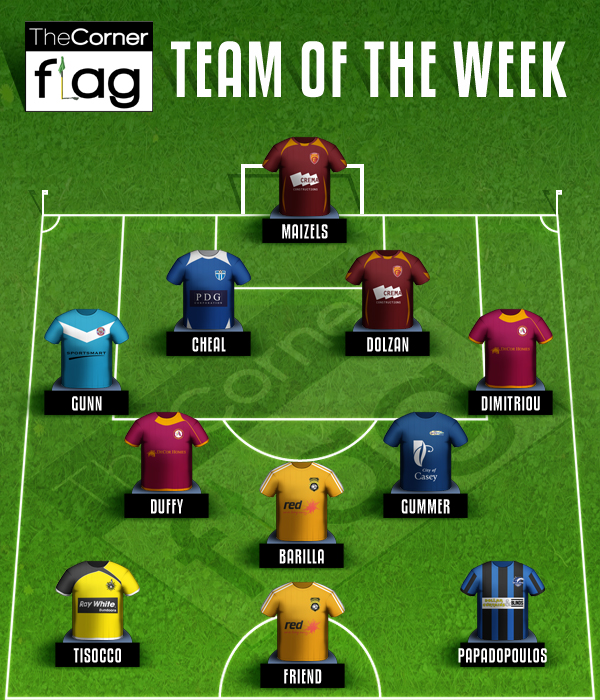 Team of the Week XI: Maizels (Bulleen); Gunn (Sandringham), Cheal (South Melbourne), Dolzan (Bulleen), Dimitriou (Altona); Duffy (Altona), Barilla (Bundoora), Gummer (Casey); Tisocco (Heidelberg), Friend (Bundoora), Papadopoulos (Box Hill)